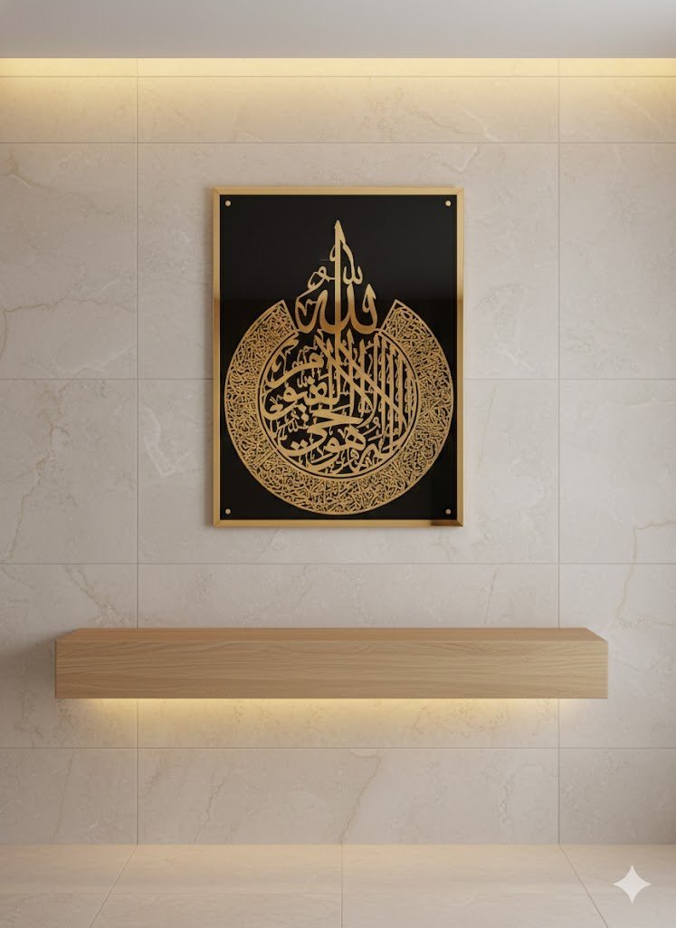 This beautifully crafted piece features the majestic verse from Surah Al-Baqarah, Ayatal Kursi, in elegant Arabic calligraphy, carefully designed to inspire peace and tranquility.